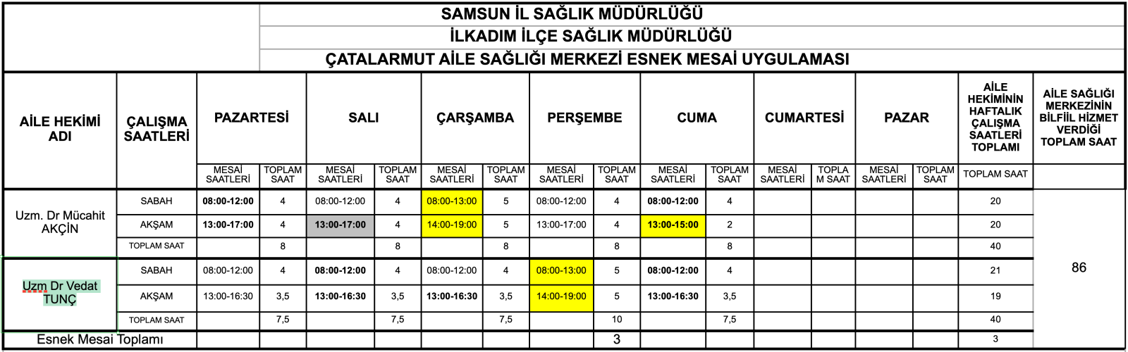 Çatalarmut Aile Sağlığı Merkezi Esnek Mesai Uygulaması Çalışma Saatleri